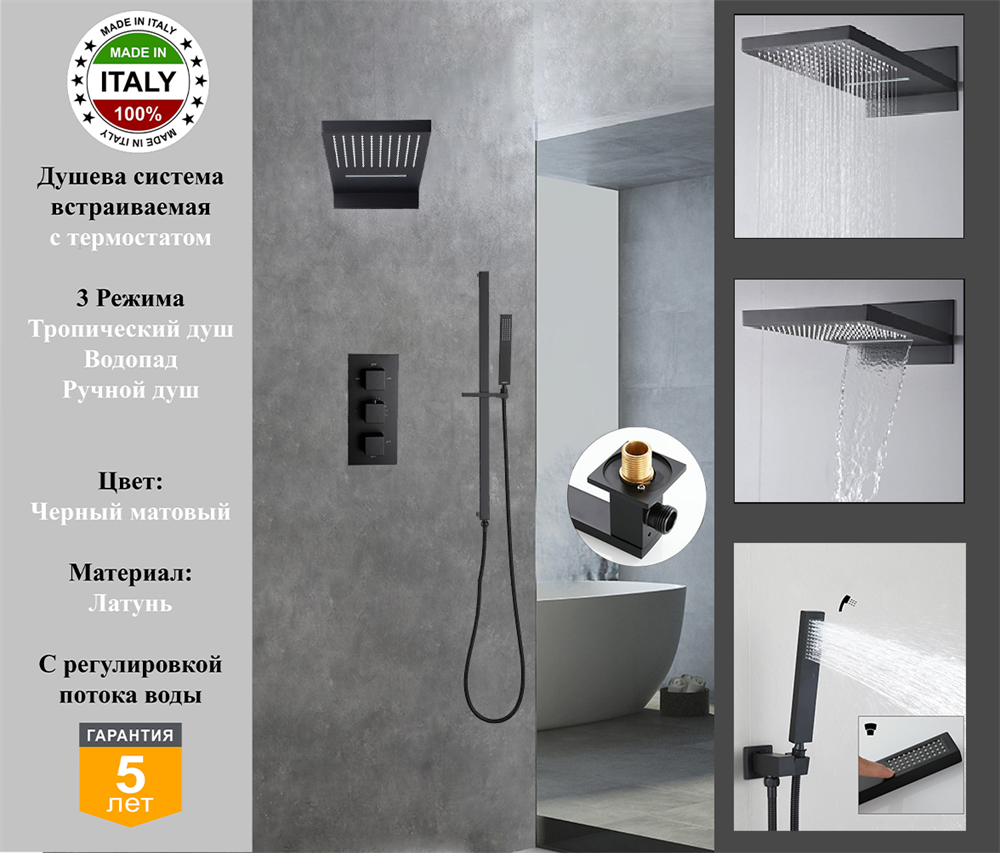 Откройте для себя новый уровень комфорта и современного дизайна с душевой системой Gristo Black Matte Termo GBT-5052-1. Этот встраиваемый душевой комплект станет настоящим украшением вашего дома благодаря своему стильному черному матовому исполнению.