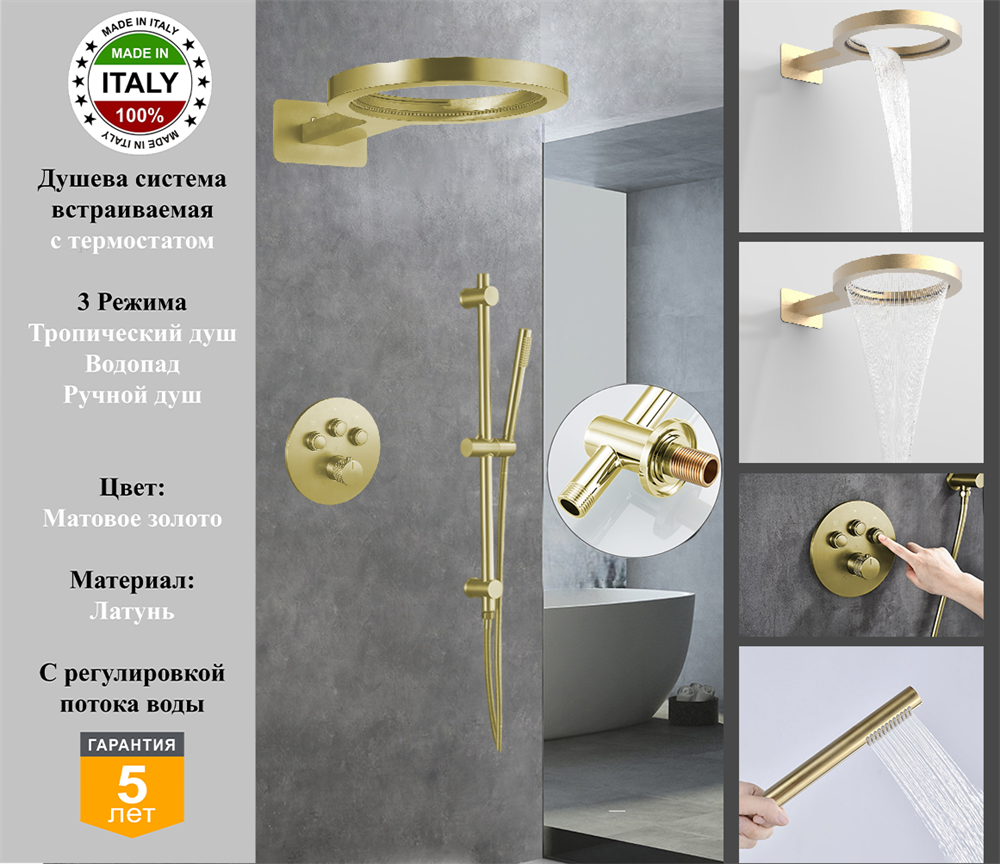 Душевая система скрытого монтажа c термостатом Gristo Gold Matte Termo GGMT-6053-1 матовое золото