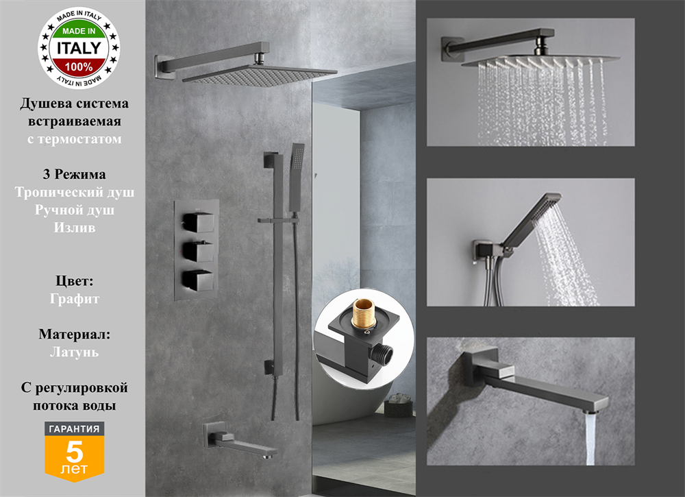 Душевая система скрытого монтажа Gristo Graphite Termo GRT-4062-1 - это современный и стильный вариант для тех, кто предпочитает элегантность и практичность. Этот комплект состоит из всех необходимых элементов для создания комфортного душа: верхний душ, душевая лейка, штанга, излив и переключатель потоков. Особенностью данной системы является ее скрытый монтаж, что делает ее идеальным выбором для тех, кто хочет создать просторную ванную комнату без лишних элементов.