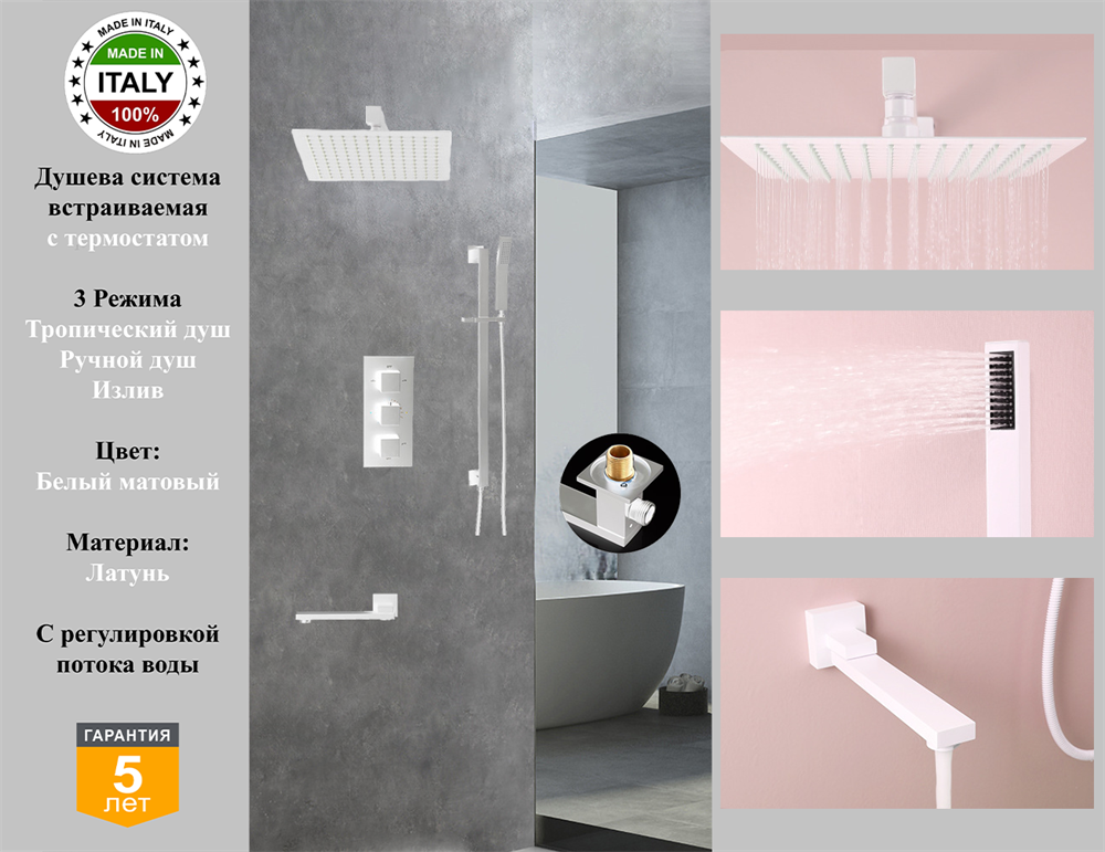 Душевая система скрытого монтажа c термостатом Gristo White Matt Termo GWMT-4062-1 - это идеальное решение для тех, кто хочет создать современную и функциональную душевую комнату. Эта система отличается высоким качеством материалов, которые используются при ее изготовлении, а также удобством использования благодаря термостатическому смесителю.