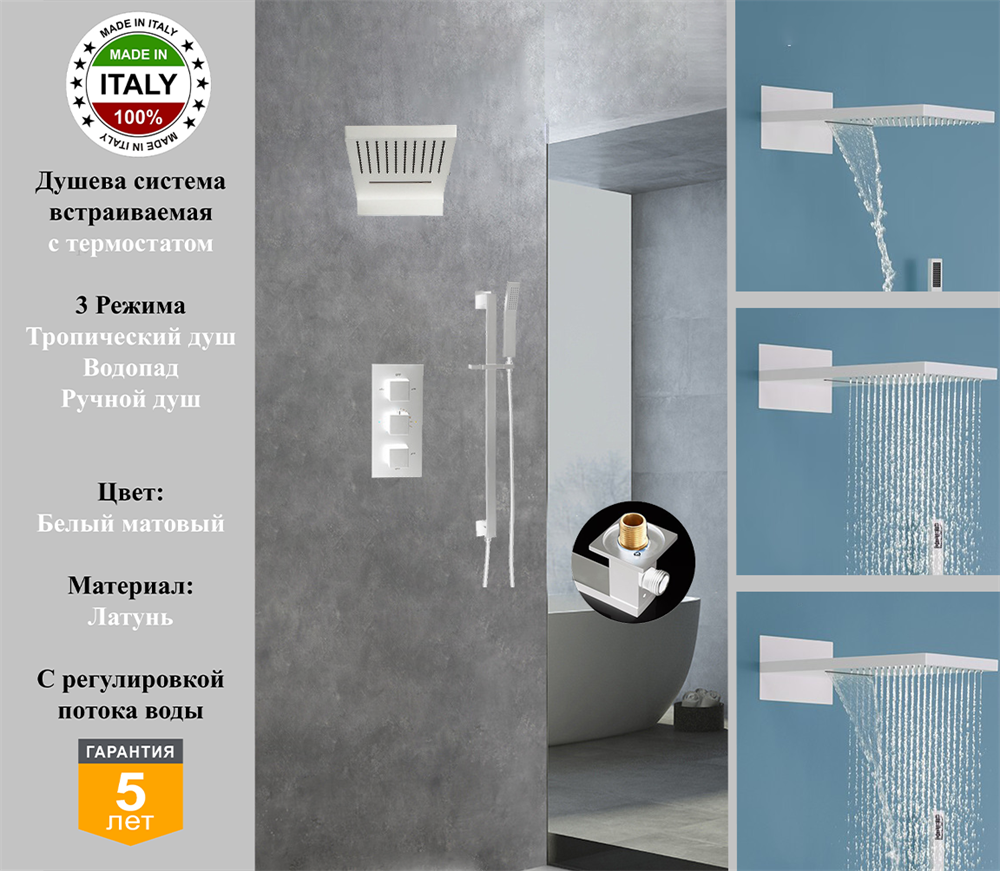 Душевая система скрытого монтажа c термостатом Gristo White Matte Termo GWMT-5052-1 белый матовый