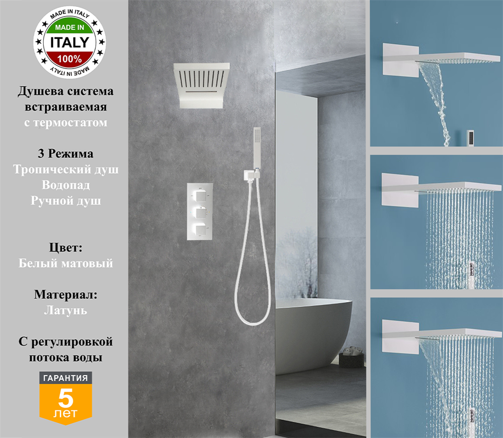 Душевая система Gristo White Matte Termo GWMT-5052 производится в Италии, где качество продукции всегда на высшем уровне. Она имеет гарантию 5 лет и является отличным выбором для тех, кто хочет создать современную и функциональную ванную комнату.
