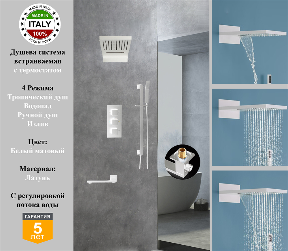 Душевая система скрытого монтажа c термостатом Gristo White Matte Termo GWMT-5062-1 белый матовый