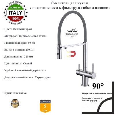 Смеситель для кухни с подключением к фильтру гибким изливом и магнитным держателем Gristo Chrome Matte GCM-3103-1 матовый хром